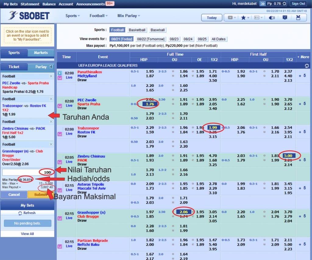 Mix parlay merupakan salah satu jenis taruhan bola yang disediakan oleh SBOBET atau MAXBET. Kedua Perusahaan Betting Online terbesar di Asia Tenggara ini sangat terkenal sekali pasaran taruhan olahraganya (Sportbook), terutama taruhan Mix Parlay. Hal tersebut membuat para bettor tak ketinggalan mengikuti dan memasang taruhan bola Mix Parlay untuk mencoba peruntungannya meraih banyak kemenangan. Untuk bisa mengikuti Taruhan Mix Parlay, Anda harus memiliki sebuah akun Mix Parlay SBOBET atau Maxbet.
