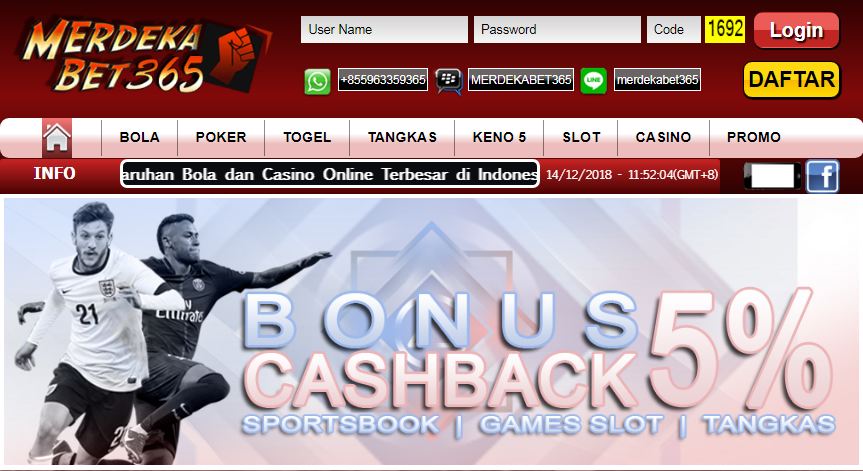 - Merdekabet365 memberikan 1 (satu) User ID untuk bermain banyak permainan sekaligus, jadi bukan hanya Judi Bola saja. Dengan menggunakan ID yang sama, Anda sudah bisa bermain Live Casino, Togel, Poker Online, Slot Game, Keno 5 Ball & Bola Tangkas.